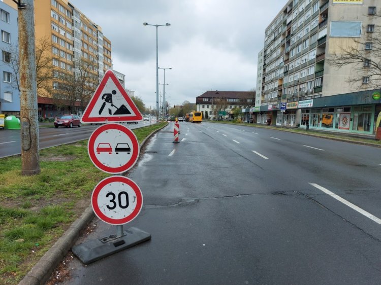 Közműfedél szintbehelyezési munkálatait végzik a Ferenc körúton a balra kanyarodó sávban, a forgalmi sávot leszűkítették.