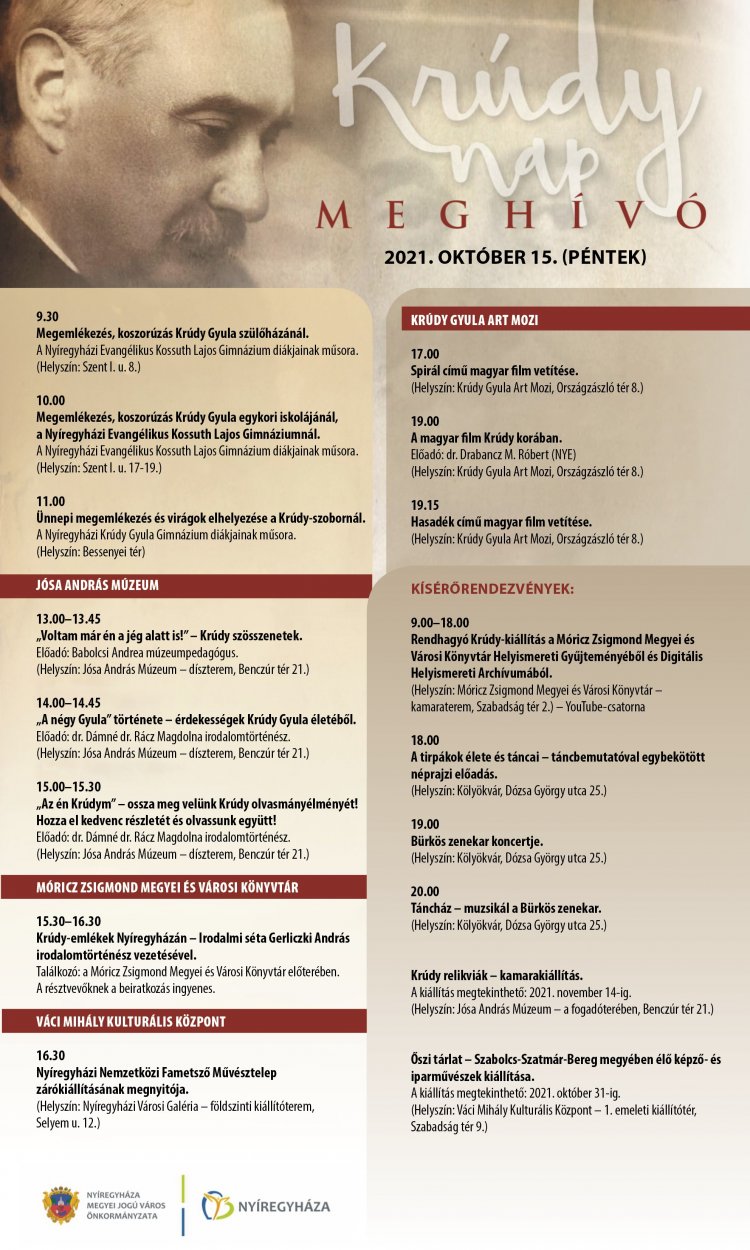 Krúdy Gyula születésének 143. évfordulójára emlékeznek Nyíregyházán, október 15-én. Több helyszínen, egész napos programsorozattal várják az érdeklődőket.