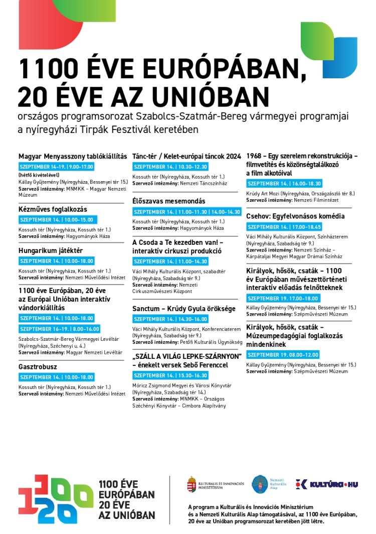 Az Európai Unió Tanácsának soros elnöksége jegyében 1100 éve Európában, 20 éve az unióban címmel országos kulturális programsorozat indult augusztusban. A programsorozatot Nyíregyházára is megérkezik, számos érdekes és értékes előadással, filmvetítéssel, játszóházzal, gasztrobusszal. A program szeptember 14-én érkezik meg a szabolcsi megyeszékhelyre és a Tirpák Fesztivál egyik eleme lesz. A folytatás pedig 19-én esedékes.