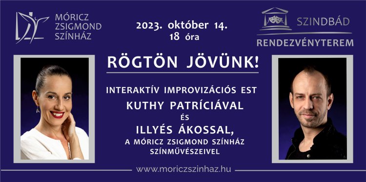 A Móricz Zsigmond Színház színművészei közös játékra invitálják a nagyérdeműt. Rögtön jövünk! címmel Kuthy Patrícia és Illyés Ákos, a nyíregyházi teátrum népszerű színművészei virtuóz, improvizációs játékok és helyszíni ötletek alapján születő jelenetekkel szórakoztatják nézőiket 2023. október 14-én, szombaton a Szindbádban.