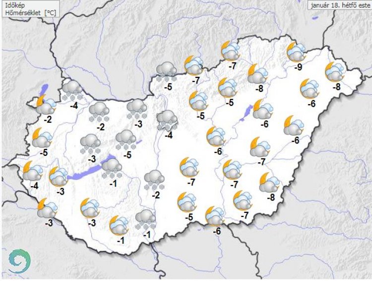 A legmagasabb nappali hőmérséklet +1 és -6 fok között várható, délnyugaton lesz enyhébb az idő. Késő estére -2 és -8 fok közé hűl le a levegő.