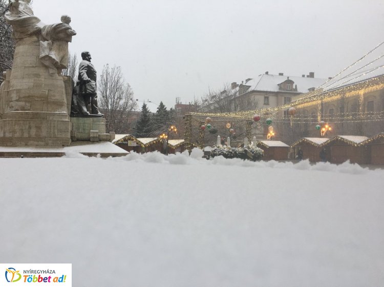 Már a reggeli órákban is intenzíven esett a hó Nyíregyházán, fotósunk, Szarka Lajos az adventi forgatag faházait és a belváost kapta lencsevégre hótakaró alatt!