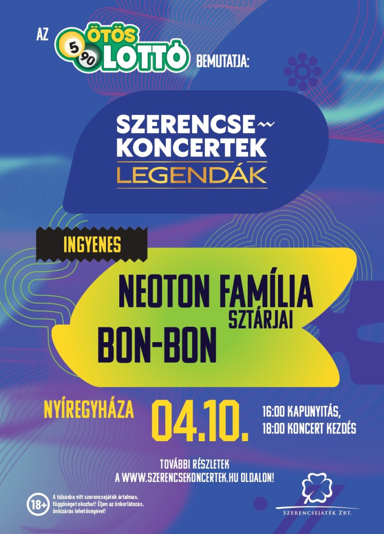 Újabb országos koncertsorozattal ünnepli az idén közel hetvenéves Ötöslottót a Szerencsejáték Zrt. A Szerencsekoncertek elnevezésű programsorozat hatvan állomásból áll, és az ország számos városába elviszi a koncertélményt. Április 10-én Nyíregyházára érkezik a rendezvény, ahol a Bon-Bon, valamint a Neoton Família Sztárjai várják a közönséget a Kossuth téren.