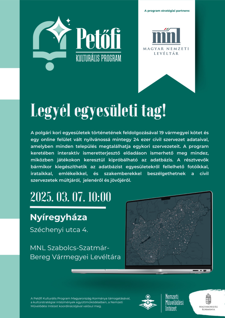 A településeken működő polgári kori egyesületekről készült adatbázist és kötetet mutatják be a MNL Szabolcs-Szatmár-Bereg Vármegyei Levéltár kutatótermében. A könyv és azadatbázis a Nemzeti Művelődési Intézet és a Magyar Nemzeti Levéltár együttműködésének köszönhetően jött létre.