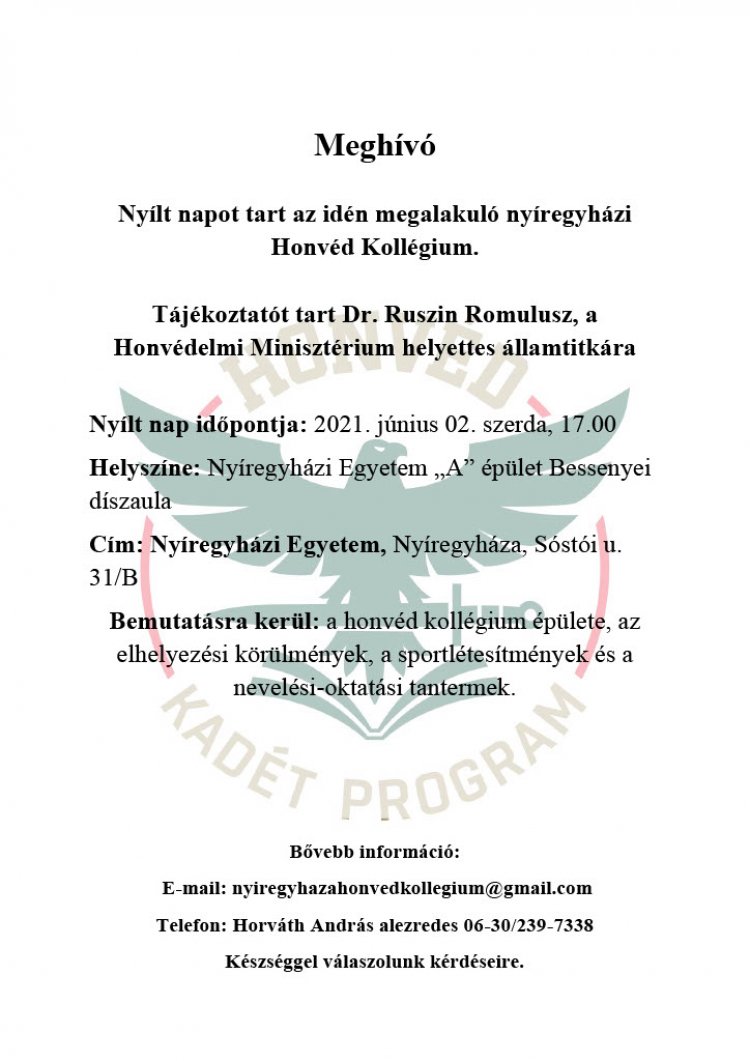 Bővebb információ: e-mail: nyiregyhazahonvedkollegium@gmail.com
