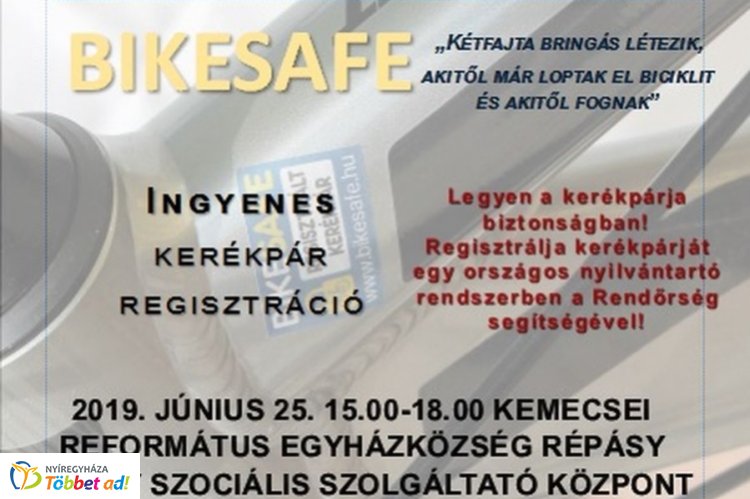 A Szabolcs-Szatmár-Bereg Megyei Rendőr-főkapitányság Bűnmegelőzési Osztályának munkatársai BikeSafe kerékpár-regisztrációra várják az érdeklődőket legközelebb 2019. június 25-én 15 órától 18 óráig a Kemecsei Református Egyházközség Répásy Mihály Szociális Szolgáltató Központban. Az országos nyilvántartási rendszerbe vételhez a rendőrök lefotózzák a jelentkezők kerékpárjait, majd rögzítik a járművek egyedi jellemzőit, és a tulajdonosok adatait. A regisztrált bicikliket végül egy matricával látják el, mely azt jelzi, hogy a kétkerekű már szerepel az adatbázisban. A kezdeményezés célja, hogy lopás esetén a jelölés segítse a keresett kétkerekű azonosítását, vagy a megtalált bicikli tulajdonoshoz történő visszajuttatását.