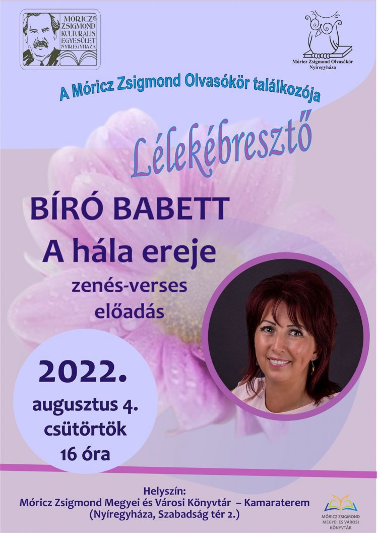 A hála ereje címmel ad zenés-verses előadást Bíró Babett a Móricz Zsigmond Megyei és Városi Könyvtárban augusztus 4-én.