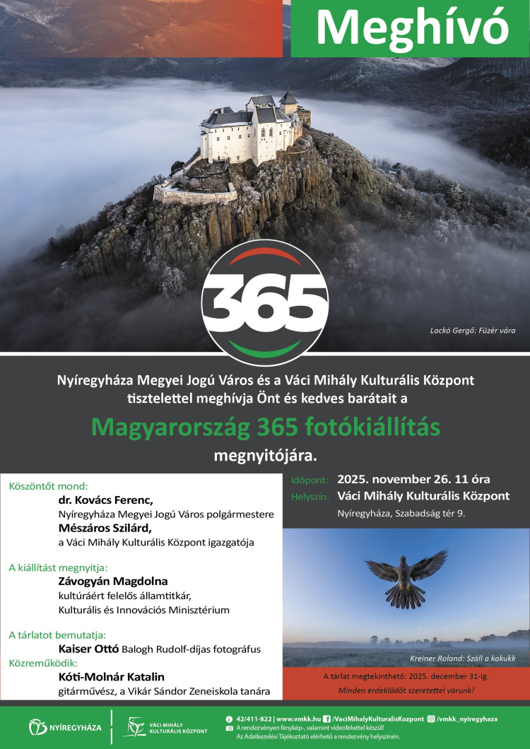 Nyíregyháza Megyei Jogú Város Önkormányzata és a Váci Mihály Kulturális Központ közös szervezésében nyílik meg a város legújabb tárlata. A kiállítás célja, hogy bemutassa Magyarország sokszínűségét, rejtett szépségeit és mindennapi csodáit, olyan alkotásokon keresztül, mint a plakáton is kiemelt Lackó Gergő „Füzér vára” vagy Kreiner Roland „Száll a kakukk” című képe.