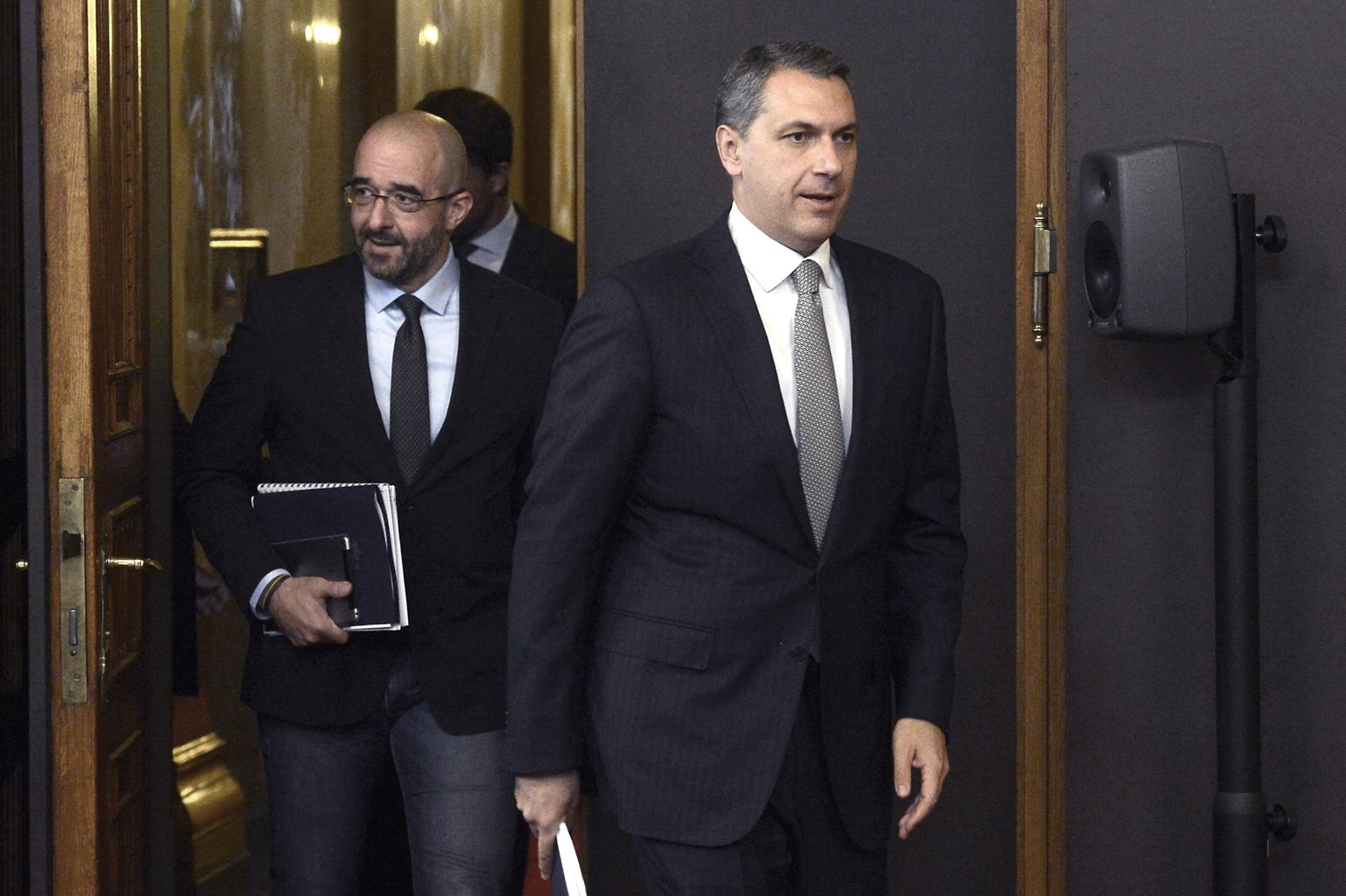 Lázár János, a Miniszterelnökséget vezető miniszter (j) érkezik századik szokásos heti sajtótájékoztatójára az Országházban 2017. október 5-én. Mögötte Kovács Zoltán kormányszóvivő (MTI Fotó: Soós Lajos)