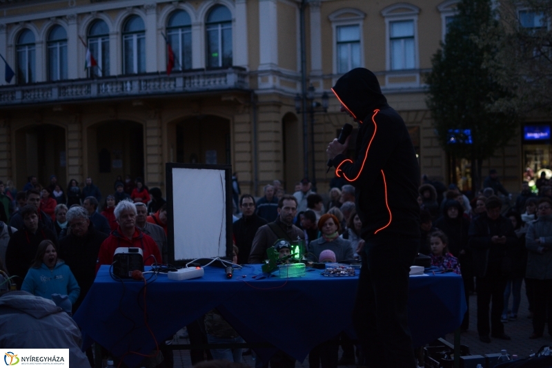 – Rávilágítok egy nagyobb teljesítményű zöld lézerrel az egyik tükörre, majd a lézersugár visszaverődik a másik tükörre – mesélte nagy átéléssel Gálik Tamás, a Nyíregyházi Főiskola Fizika Tanszékének végzett hallgatója, hogy milyen kísérlettel készültek a speciális fizikaórára. Néhány perc múlva Tarján Péter, főiskolai adjunktus vezetésével filléres eszközök, mikrokapcsolók, tükrök, elektromotorok és lézerceruza felhasználásával egészen különleges és meglepő fénytani kísérleteket mutattak be a Kossuth téren. A Nyíregyházi Főiskola így kapcsolódott be A fizika mindenkié országos programba, aminek a fizika népszerűsítése volt a célja. Mivel 2015 a fény nemzetközi éve, ezért egy a lézershow-t tartottak.