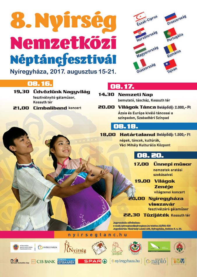 Hat ország kilenc táncegyüttese lép színpadra, hogy ízelítőt adjon a csak rá jellemző mozgásvilág motívumaiból és az adott régió népzenei kincséből. Változatos és különleges hangszerekkel megszólaltatott muzsika, ízes és virtuóz táncokkal bemutatott koreográfiák jelennek meg a szökőkút melletti színpadon, hogy elvarázsolják a nyíregyházi közönséget, s felhívják a figyelmet a csütörtöki Világok Tánca c. nagyszabású előadásra a Szabadtéri Színpadon, s a pénteki Határtalanul című különleges előadásra a Váci Mihály Kulturális Központban.