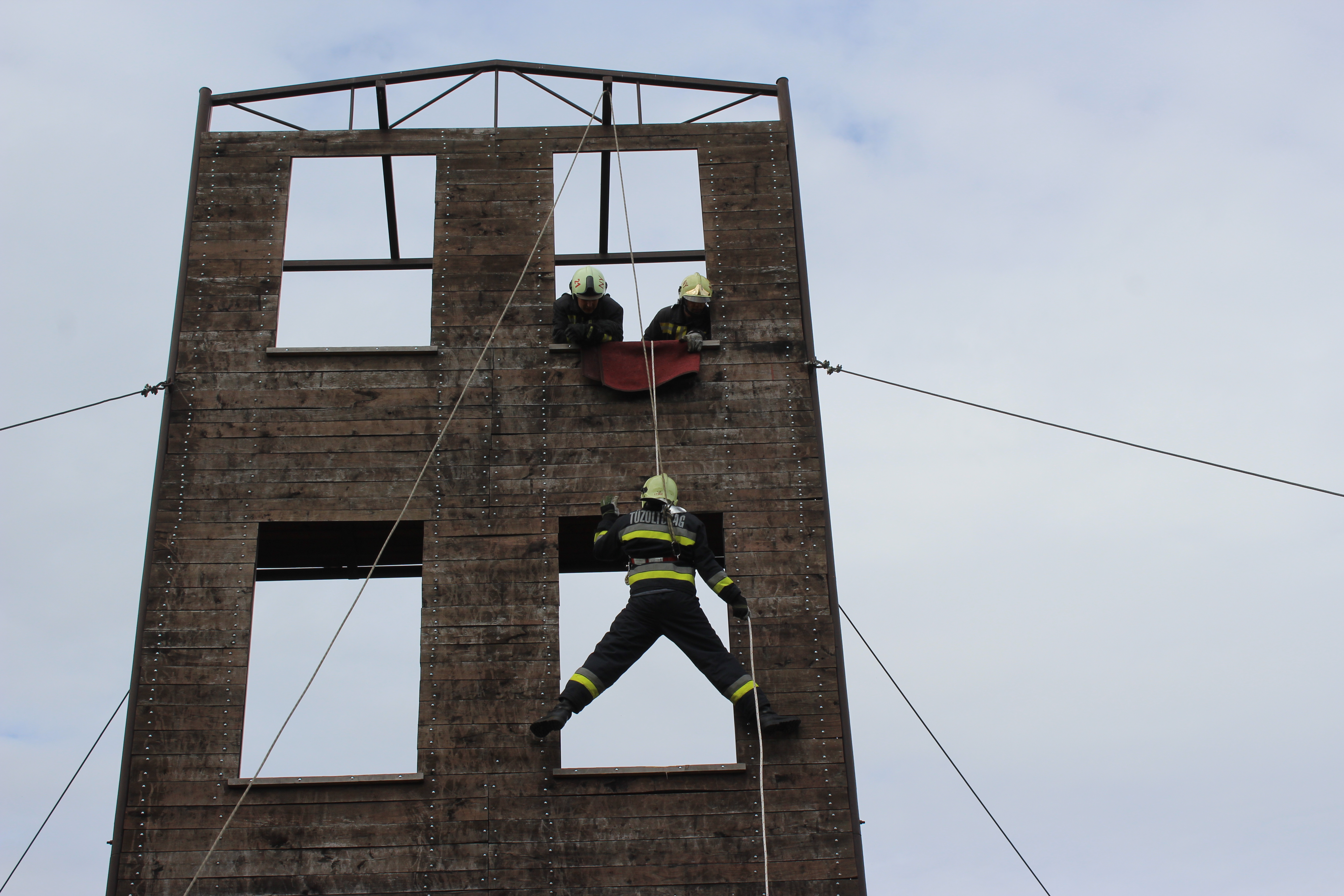 Ezt követően az önmentést gyakorolhatták a három emelet magas mászó falon, ahol kötélbiztosítással ereszkedtek le a kilenc méteres magasságból. A hármas hurok megkötését és az ön és társmentést is végrehajtotta az állomány, majd a frissen elkészült pszichikai pályán, az úgynevezett ketrecben, a labirintusban kellett végigmennie az állománynak teljes légzésvédelemben, természetesen csak a tapintásra hagyatkozhattak, hiszen a szemük be volt kötve, imitálva a sötét és füsttel telített épületeket.