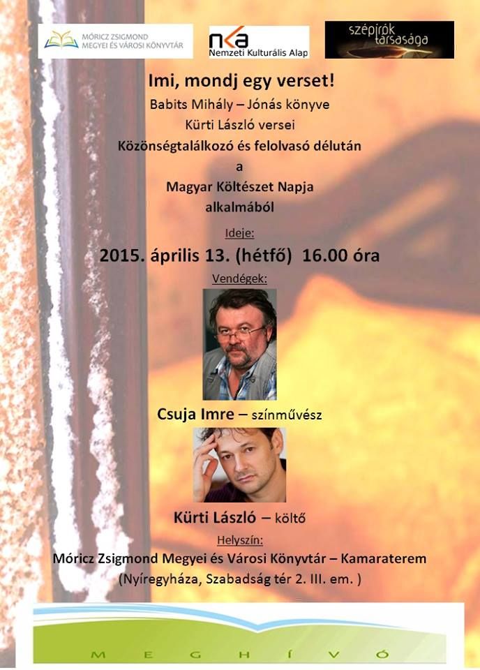 Közönségtalálkozó Kürti László költővel és Csuja Imre színművésszel április 13-án a Móricz Zsigmond könyvtárban.
