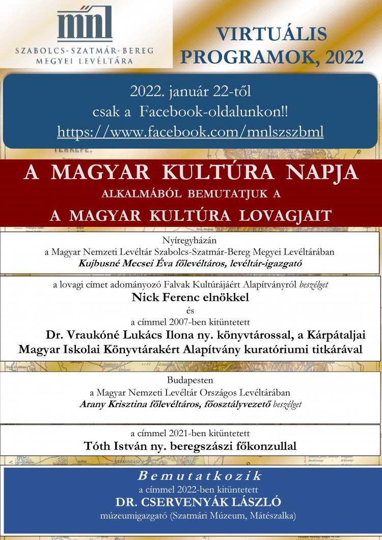 A Szabolcs-Szatmár-Bereg Megyei Levéltár Facebook-oldalán január 22-től lesz elérhető az a beszélgetés, amelyben a Magyar Kultúra Napja alkalmából a címet adományozó Falvak Kultúrájáért Alapítványt mutatja be Nick Ferenc elnök.
