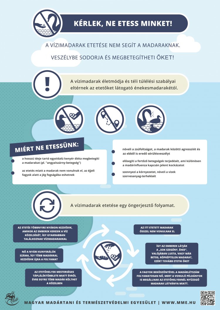 A tapasztalatok alapján az alapvetően jó szándékú emberek nincsenek tudatában annak, hogy a vízimadarak etetése felesleges, különösen nyáron, amikor korlátlanul találnak maguknak táplálékot. Etetésük ráadásul tömegesen sodorja veszélybe és betegíti meg az állatokat, ami ellen világszerte küzdenek a hatóságok és a természetvédelmi szervezetek. Ezért a Magyar Madártani és Természetvédelmi Egyesület (MME) arra kéri a víz mellett sétálókat, strandolókat, kirándulókat és nyaralókat, hogy sehol és semmivel ne etessék a vízimadarakat.