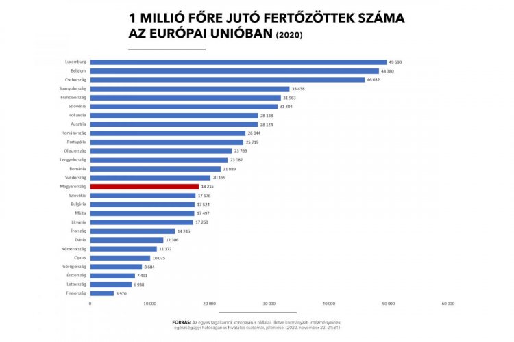 Fertőzöttek terén továbbra is a legjobban teljesítő országok között vagyunk, az uniós átlag továbbra is jóval magasabb a magyar adatnál. 14 másik EU-tagállam előz meg minket az egymillió főre vetített fertőzöttek számában: Luxemburg, Belgium, Csehország, Spanyolország, Franciaország, Szlovénia, Hollandia, Ausztria, Horvátország, Portugália, Olaszország, Lengyelország, Románia, Svédország.