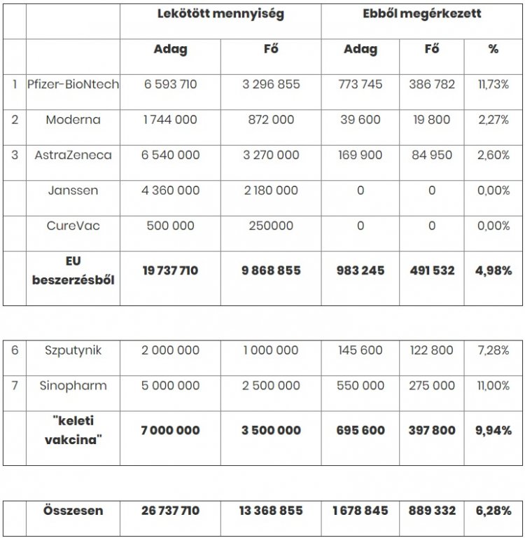Magyarország 9,8 millió ember oltásához elég oltóanyagot vár az uniós beszerzésből, ebből eddig 491 ezer ember oltására elég vakcina érkezett meg (4,9%) három gyártótól: Pfizer, Moderna, AstraZeneca. A Janssen és CureVac még nem rendelkezik uniós engedéllyel, így még nem is szállított oltóanyagot hazánkba.
