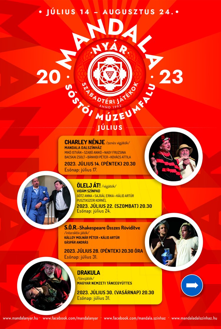 Vígjáték, zenés vígjáték, táncjáték, zenés-történelmi játék, operett est is várja a nézőket a Mandala Nyár 2023 programjain. A szabadtéri produkciók sora július 14-én a Charley nénje zenés vígjátékkal kezdődik, augusztus 24-én pedig egy rendhagyó Fábry Show-val zárul.