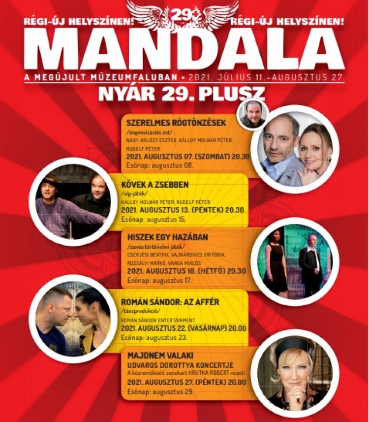 Tíz előadást tervezett a nyárra a Mandala Dalszínház. A tavalyi fél nyarat és a mostani szűkített esztendőt is tekintve a Mandala Nyár a 29.Plusz számot viseli idén. Saját előadások és vendégjátékok fogadják a Sóstói Múzeumfaluban a Mandala közönségét július 11. és augusztus 27. között.
