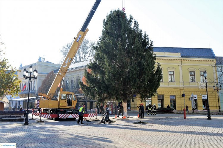 A Rövid utcában annyi fenyő van, hogy akár ezt a nevet is kaphatta volna az utca, ezt Snekszer Mihályné mesélte, aki felajánlotta a házuk előtt álló lucfenyőt. A fához sok emléke kötődik, még a ’80-as években ültették, rengeteg madárnak biztosított otthont, most mégis úgy döntöttek, felajánlják a város számára. A város karácsonyfája ebben az évben egy 16 méteres lucfenyő lesz. Nem kis munka egy ekkora fenyő kivágása és szállítása, az elmúlt évekhez hasonlóan most is a városüzemeltetési társaság vállalta a munkálatok lebonyolítását, ami nem kevés egyeztetést és összehangolt munkát igényelt. Végül pénteken dél után pár perccel érkezett meg a Kossuth térre, ahol a következő heteket tölti majd és díszíti a várost az ünnepek alatt.