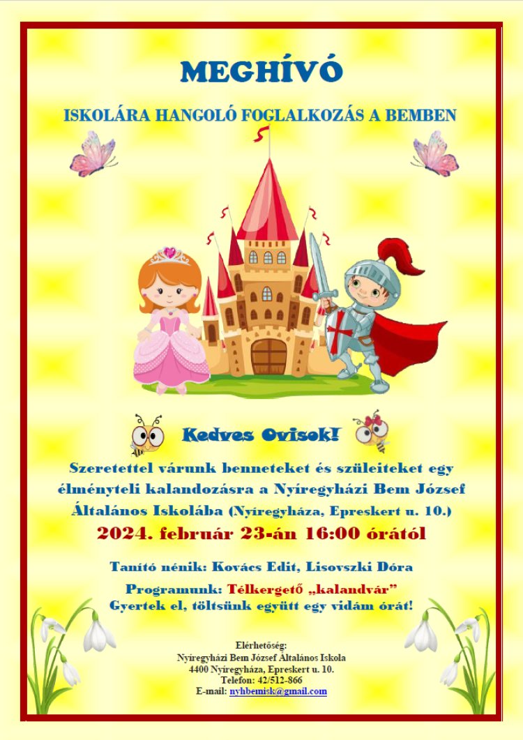 A Nyíregyházi Bem József Általános Iskola vidám, játékos, mesebeli kalandozásra várja a nagycsoportos óvodásokat iskolára hangoló foglalkozás keretében 2024. február 23-án pénteken 16 órától.
