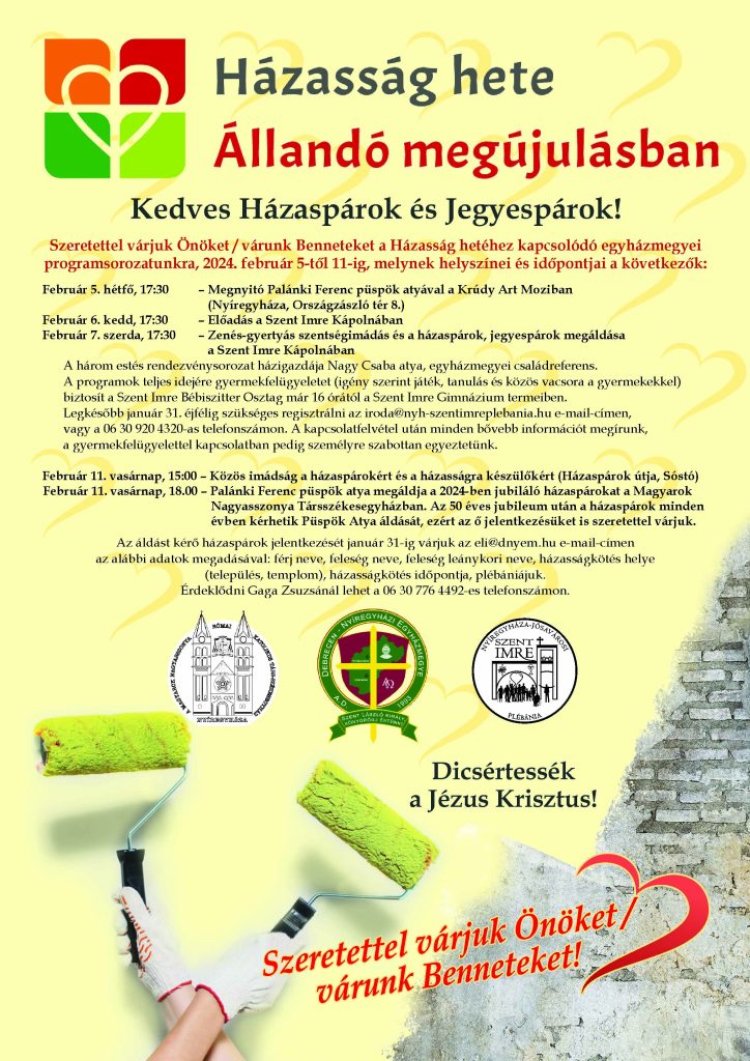 Állandó megújulásban mottóval hirdetik meg idén a Házasság Hetét (február 11-18), amelyhez a Debrecen-Nyíregyházi Egyházmegye február 5-11-ig tartó programsorozatával csatlakozik.