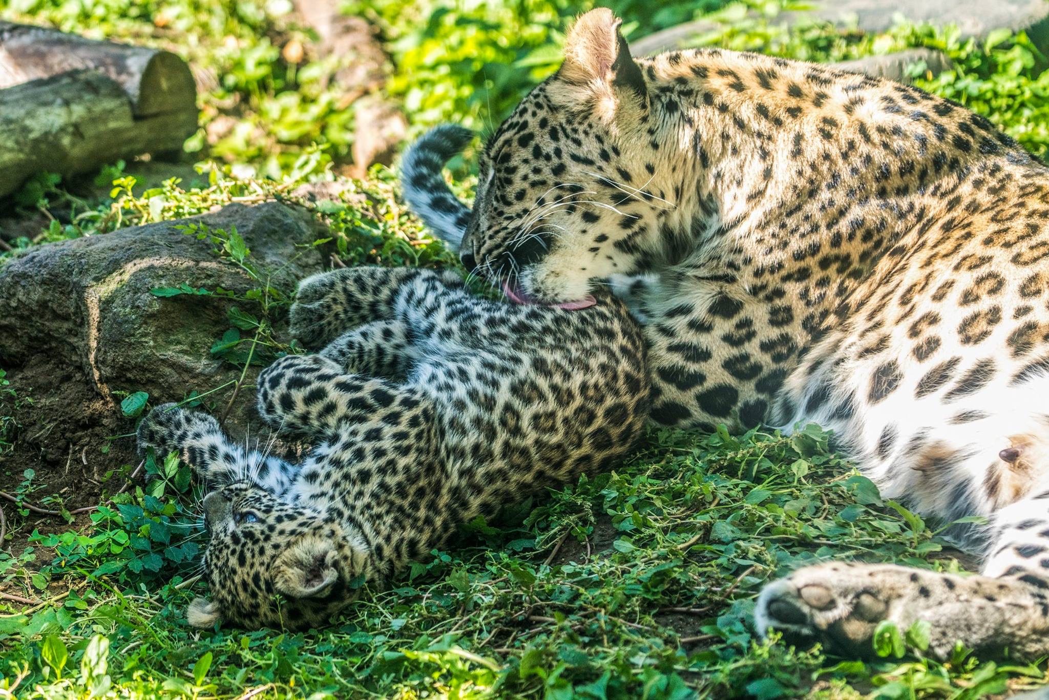 A 12 hetes kölykök eleinte egy látogatóktól elzárt barlangrendszerben cseperedtek, de most, hogy 3 hónapossá váltak, elkezdtek ismerkedni a külvilággal.Bár anyjuk eleinte visszacipelte a szájában a kalandvágyó cicákat, mára már szabad utat enged kíváncsi kölykeinek, a számukra sok-sok újdonsággal szolgáló nagy kifutóban, így a ritka nagymacskákat a szerencsésebb látogatók már megleshetik.