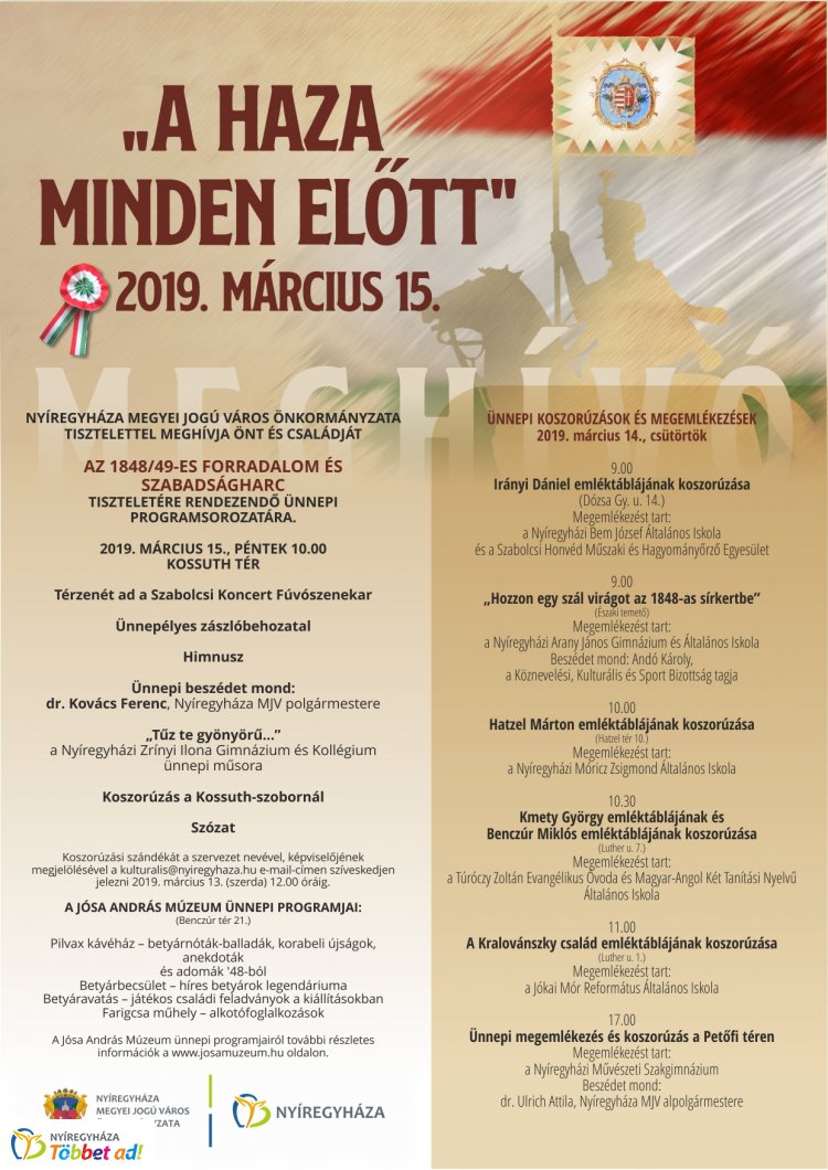 9.00 - Megemlékezés és koszorúzás Irányi Dániel emléktáblájánál (Dózsa Gy. u. 14.), a Nyíregyházi Bem József Általános Iskola és a Szabolcsi Honvéd Műszaki és Hagyományőrző Egyesület közreműködésével.
