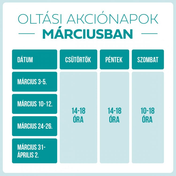 Az átoltottság további növelése és a járvány újabb hullámának megfékezése érdekében márciusban is minden csütörtök és péntek délután, és szombaton oltási akciót szervezünk a kórházi oltópontokon és a kijelölt járásközponti szakrendelőkben.
