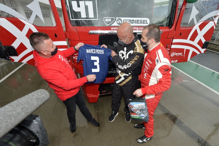 Marco Rossi Kozák Attila csapatvezetőtől egy Szpari mezt is átvehetett, majd Kiss Norbert mellé egy körre is beülhetett a versenykamionba az olasz szakember.