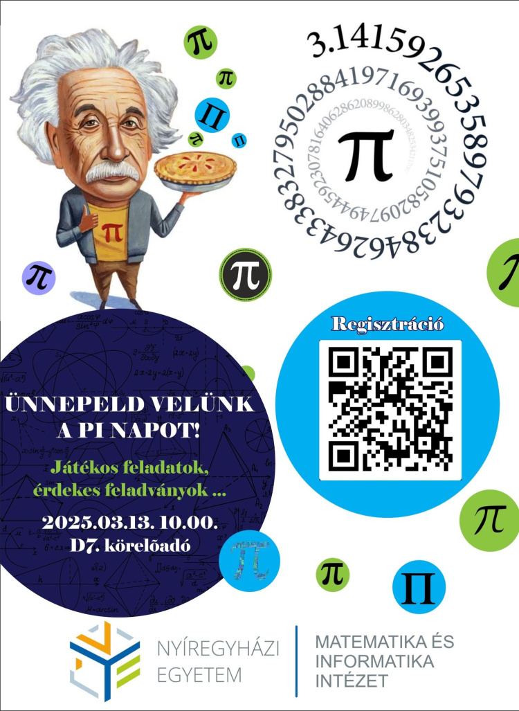 A Matematika és Informatika Intézet negyedik alkalommal rendez számválasztásos matematikaversenyt a nemzetközi π-nap és a matematika világnapja alkalmából. A 2025. március 13-án (csütörtökön) a 7-es körelőadóban (D7) 10 órától kezdődő versenyen az előzetesen regisztrált középiskolák diákjai vesznek részt. A megmérettetésen egy óra alatt 13+1 fejtörő feladványt kell megválaszolniuk a résztvevőknek.