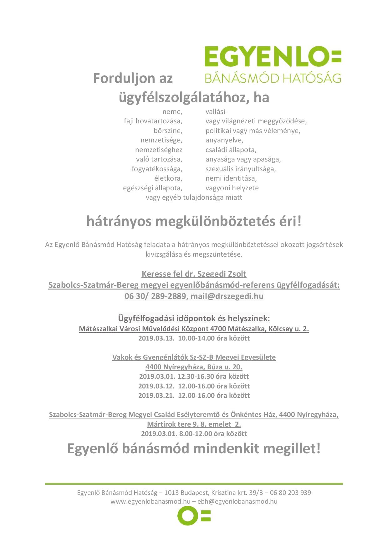 Az ügyfélfogadás havonta három alkalommal a megyeszékhelyen, és minden hónapban egyszer valamelyik járásban kerül megtartásra. A 2019. március havi járási ügyfélfogadás helyszíne Mátészalka. Amennyiben településükön valaki az egyenlő bánásmód követelményének megsértése miatti panasszal kíván élni, és ezt jelzik felénk, úgy a soron következő járási ügyfélfogadás szervezésénél ezt figyelembe vesszük.