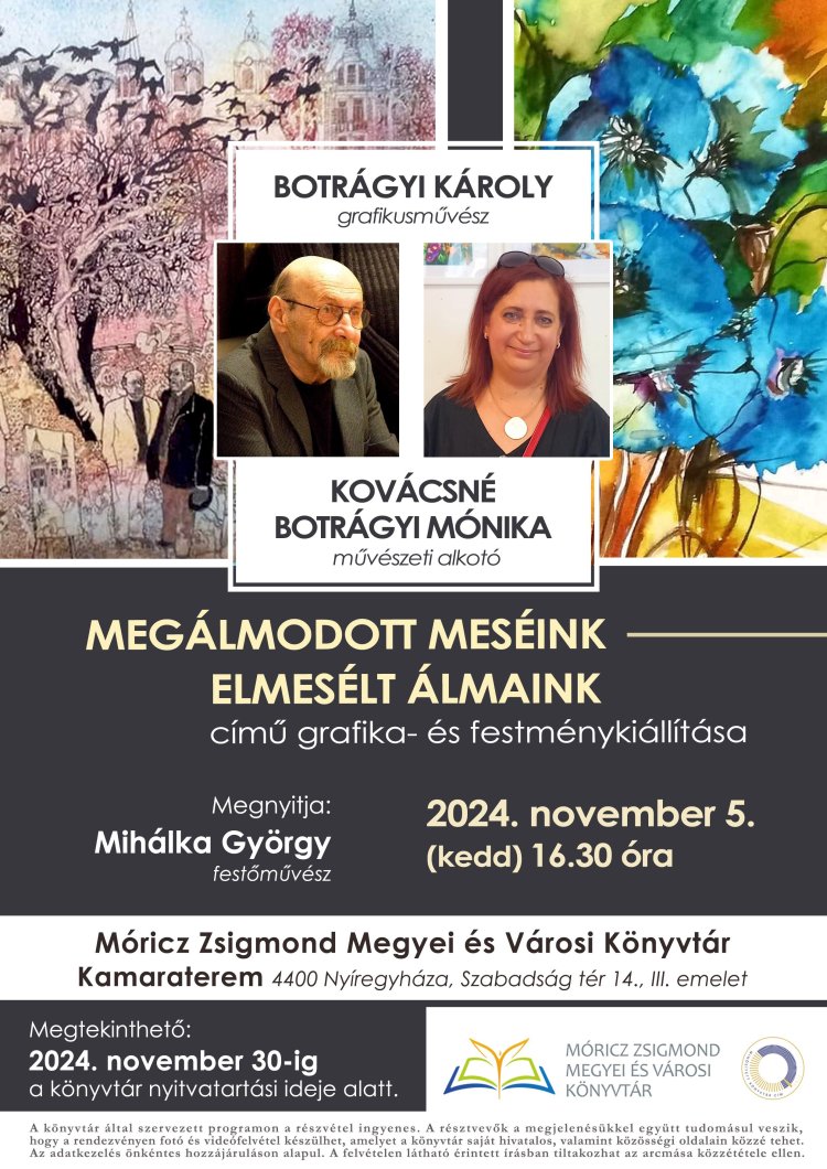 Botrágyi Károly (grafikusművész) és Kovácsné Botrágyi Mónika (művészeti alkotó) – Megálmodott meséink – elmesélt álmaink címmel grafika- és festménykiállítás nyílik a Móricz Zsigmond Megyei és Városi Könyvtárban.