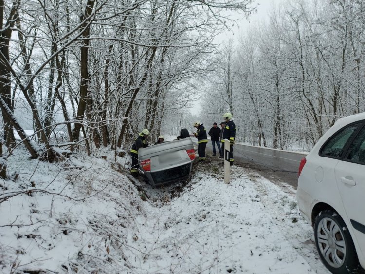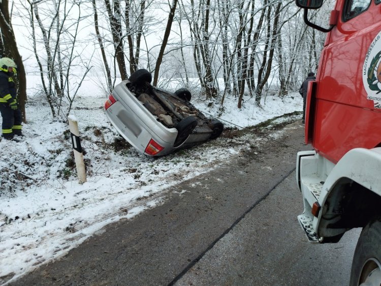 Megcsúszott egy autó és az árokba borult Kemecse külterületén.