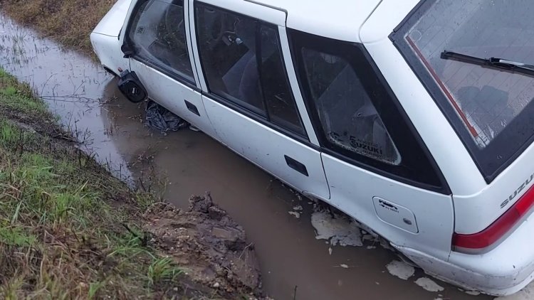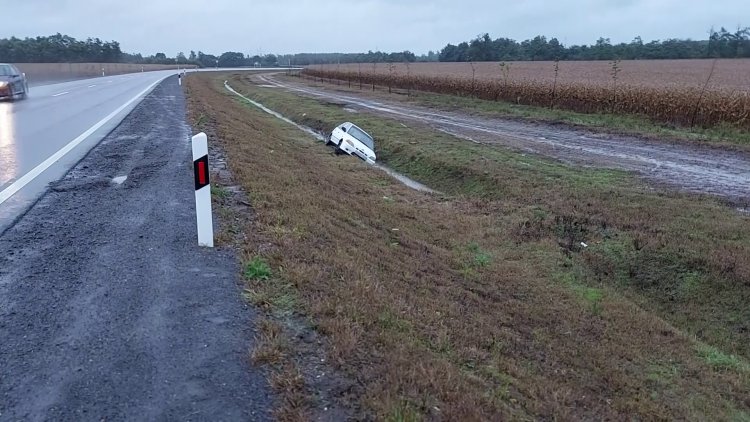A járművezető nem tudta kihúzni a gépkocsiját a közel három méter mély árokból. A vizes, csúszós utakon nagyobb óvatossággal és körültekintéssel közlekedjenek az autósok.