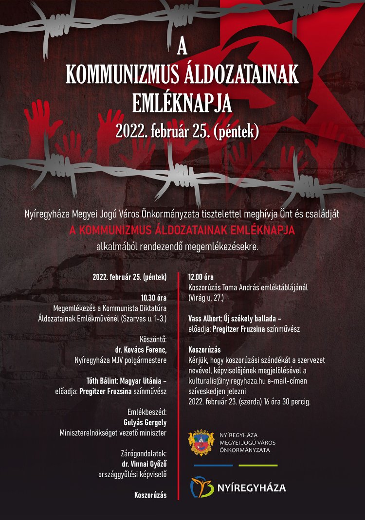 A Kommunizmus Áldozatainak Emléknapja alkalmából megemlékezéseket tartanak Nyíregyházán, február 25-én. 10.30 órakor a Szarvas utca elején, a kommunista diktatúra áldozatainak emlékművénél hajtanak fejet az egybegyűltek, majd 12 órakor Toma András, az utolsó magyar hadifogoly Virág utcai emléktáblájánál helyezik el a kegyelet koszorúit.