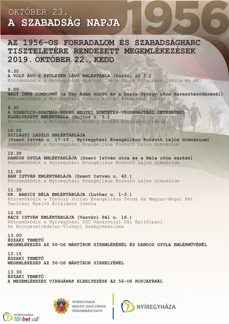 Nyíregyháza MJV Önkormányzata az 1956-os forradalom és szabadságharc 63. évfordulója alkalmából rendezett megemlékezés-sorozatának részeként október 22-én (kedden) tizenegy helyszínen lesz megemlékezés és koszorúzás. Az önkormányzati ünnepi megemlékezésre október 23-án (szerdán) 10 órakor kerül sor a Váci Mihály Kulturális Központban.