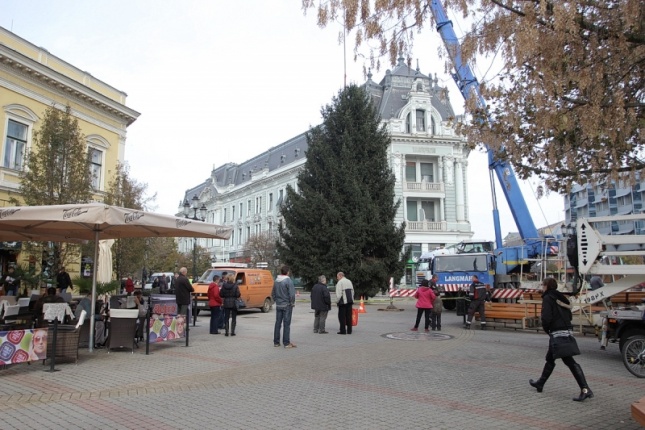 A városközpontban a NYÍRVV Kft. munkatársai már a nem hétköznapi méretű karácsonyfatalppal várták a belváros legfontosabb ünnepi díszét. A szakemberek újra a daru segítségével állították a helyére az óriási fenyőt a Takarékpalota előtt. A nézelődők azt is észrevehették, hogy a faházakkal már most kialakították a teret a karácsonyi forgatag fogadására.