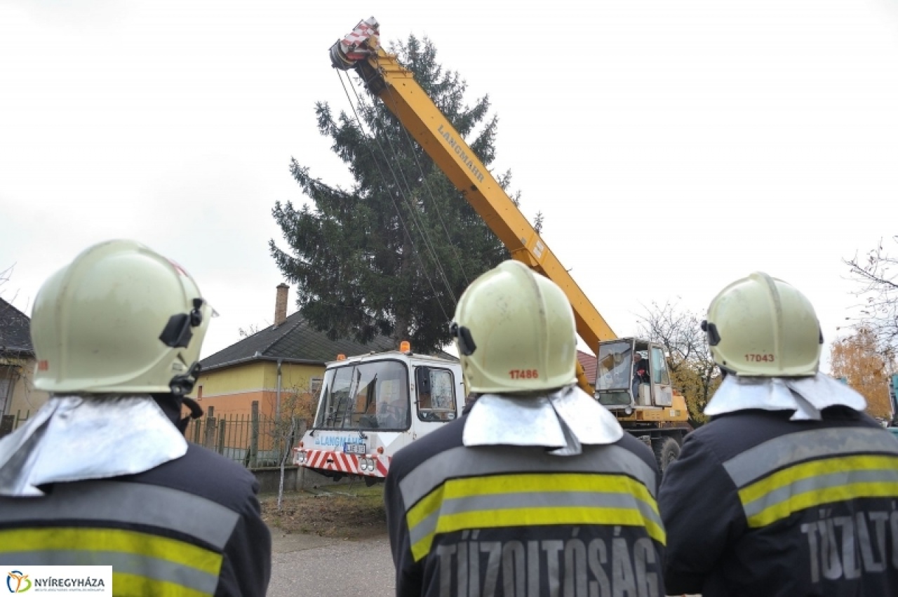 A tűzoltók segítségével vágták ki egy borbányai ház udvarán az idei nyíregyházi karácsonyi forgatag fenyőfáját. A vágás előtt egy daru kötéllel rögzítette az óriást, majd ezzel emelték át a szállító járműre. A közel félszáz éves, 16 méteres fenyő már kinőtte az udvart, ezért ajánlották fel a ház tulajdonosai. A fenyőt szállító jármű a tűzoltók kíséretében érkezett meg a Kossuth térre, ahol a NYÍRVV Kft. munkatársai már a nem hétköznapi méretű karácsonyfatalppal várták a belváros legfontosabb ünnepi díszét. A szakemberek újra a daru segítségével állították a helyére az óriási fenyőt a Takarékpalota előtt.
