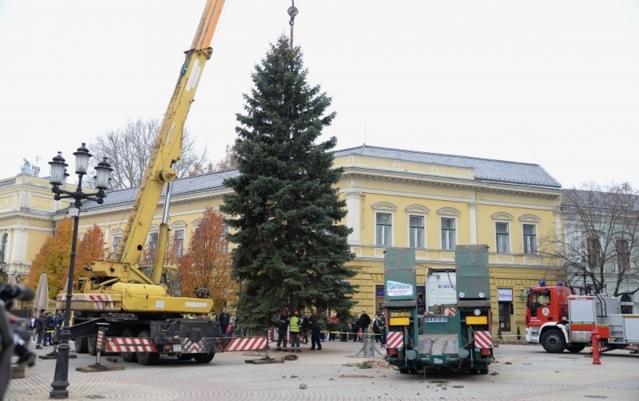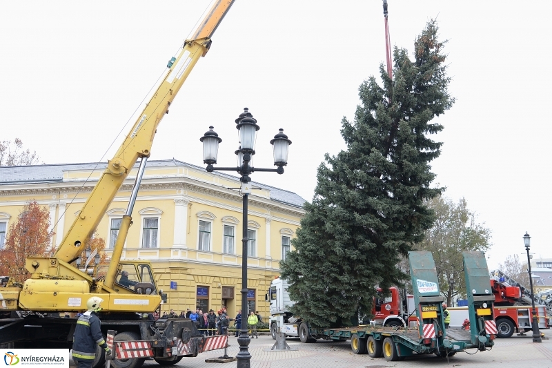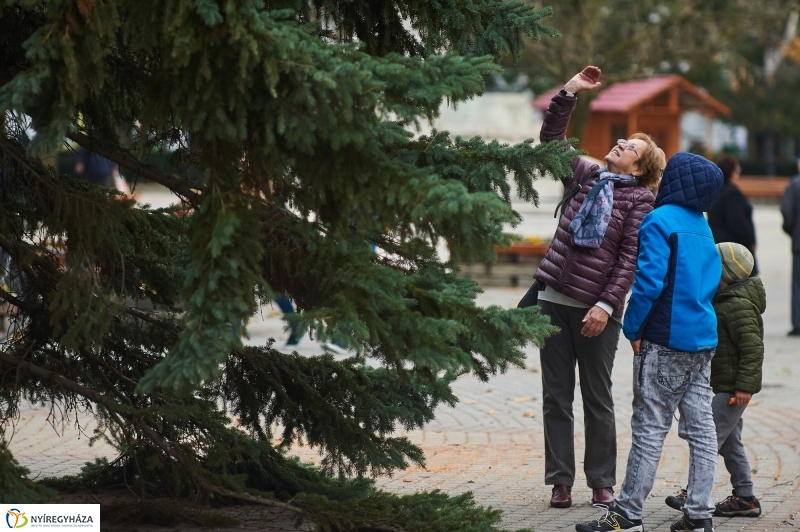 A tűzoltók segítségével vágták ki egy sóstógyógyfürdői ház udvarán az idei nyíregyházi karácsonyi forgatag fenyőfáját. Egy daru kötéllel rögzítette az óriást, majd ezzel emelték át a szállító járműre. A 30 éves, 13 méteres fenyő már kinőtte az udvart, ezért ajánlották fel a ház tulajdonosai. Gellért Sándor elmesélte, a fát édesapja és nagyapja ültette 1987-ben. Már túlnőtte a házat, de nem akarták, hogy a kivágás után tűzifa legyen belőle. Így ajánlották fel a városnak, hogy karácsonykor a nyíregyháziakkal együtt karácsonyfaként gyönyörködhessenek benne. A fenyőt szállító jármű a tűzoltók kíséretében érkezett meg a Kossuth térre, ahol a NYÍRVV Kft. munkatársai már a nem hétköznapi méretű karácsonyfatalppal várták a belváros legfontosabb ünnepi díszét. A szakemberek újra a daru segítségével állították a helyére az óriási fenyőt a Takarékpalota előtt. A város karácsonyfájára a hagyományos piros színű díszítés és több mint 3 km hosszúságú égősor, valamint 33 db óriás szaloncukor is kerül.