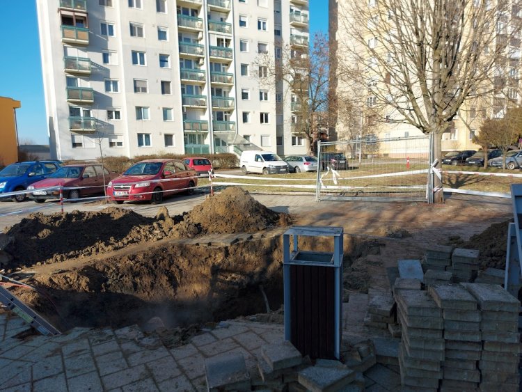A parkolók egy részét és a térburkolat egy részét is felbontották a Fazekas János téren a munkálatok idejére.