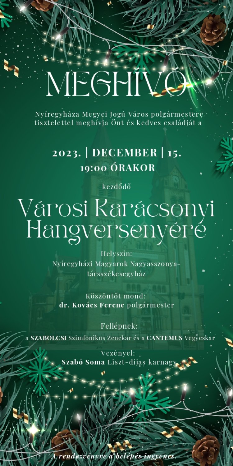 Nyíregyháza Megyei Jogú Város polgármestere tisztelettel meghívja Önt és kedves családját a 2O23 . | DECEMBER | 15 . 19:oo ÓRAKOR kezdődő Városi Karácsonyi Hangversenyére.