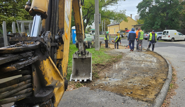 Dolgozott a markoló, bontották a régi járda aszfaltját az Árok utcán. Itt pedig már a lapvibrátor berregett, készítette elő a talajt a megújuló járdaszakasz építéséhez.