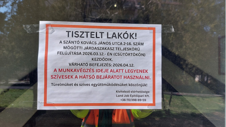 Megkezdődött a Szántó Kovács János utca 2–16. szám mögötti szakaszon a meglévő járda felújítása, amelynek célja a gyalogos közlekedés biztonságának és komfortjának javítása. A munkálatok során a burkolat megújul, valamint a járda állapota a mai elvárásoknak megfelelően kerül helyreállításra.