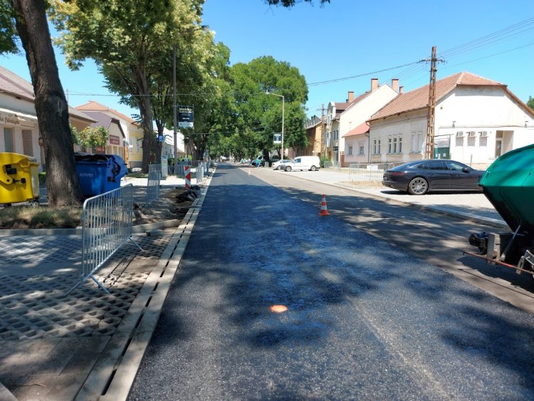 Megkezdődött az aszfaltozás a Szarvas utcán, de még kedden is további forgalomkorlátozásra kell számítani, mert akkor helyezik majd szintbe a közműfedeleket, majd a kopóréteget a hét második felében kapja meg az utca.