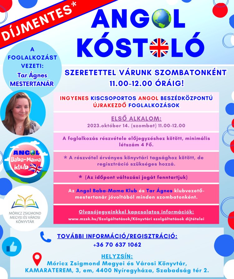 Októbertől, szombatonként 11:00-12:00 között várja Önöket is az Angol Baba-Mama klub a a Móricz Zsigmond Megyei És Városi Könyvtárban, ahol egyszerre tanulhat angolul a mama és a baba is. A foglalkozás előjegyzéshez kötött, minimális létszám 4 fő. A foglalkozást Tar Ágnes, mestertanár vezeti. Kezdés: október 14. szombat.
