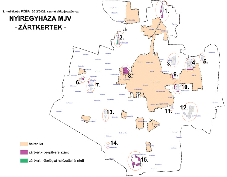 Nyíregyháza közigazgatási határán belül 15 területen körülbelül 2000 ingatlan található zártkerti besorolásban, melyből közel 340 ingatlan tartozik beépítésre szánt, azaz lakó-, üdülő- vagy gazdasági területbe, a többi ingatlan mezőgazdasági övezeti besorolású, valamint ezek közül 81 db ingatlan érintett ökológiai hálózattal. A nyíregyházi zártkerti ingatlan-tulajdonosok helyzetének megkönnyítése érdekében a közgyűlés elfogadta a 3/2026. (11. 20.) önkormányzati rendeletet a zártkerti ingatlanok művelés alóli kivonásáról. A rendelet lehetőséget nyújt Nyíregyháza Megyei Jogú Város teljes közigazgatási területén valamennyi olyan, az ingatlan-nyilvántartásban zártkert fekvéssel meghatározott ingatlan művelési ágának művelés alól kivett területként történő bejegyzésére, amely a rendelet mellékletét képező ökológiai hálózattal érintett zártkerti ingatlanok jegyzékében nem szerepel.