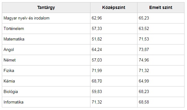 A következő táblázatban szintén átlageredményeket láthatunk, méghozzá a két szintet összehasonlítva (emelt szinten minden 60 % feletti átlageredmény 5-ös érdemjegynek felel meg). Középszinten a legrosszabb eredmény matematikából született (51,82 %, ami erős hármasnak felel meg), míg a legjobb fizikából: a diákok a maximális pontszámnak átlagosan 71,99 százalékát szerezték meg. Emelt szinten jobban teljesítettek a diákok, mint középszinten: a nehezebb, egyben több pontot érő vizsgán az eredmények átlagszázaléka 69,13 %, míg középszinten 62,80 %.