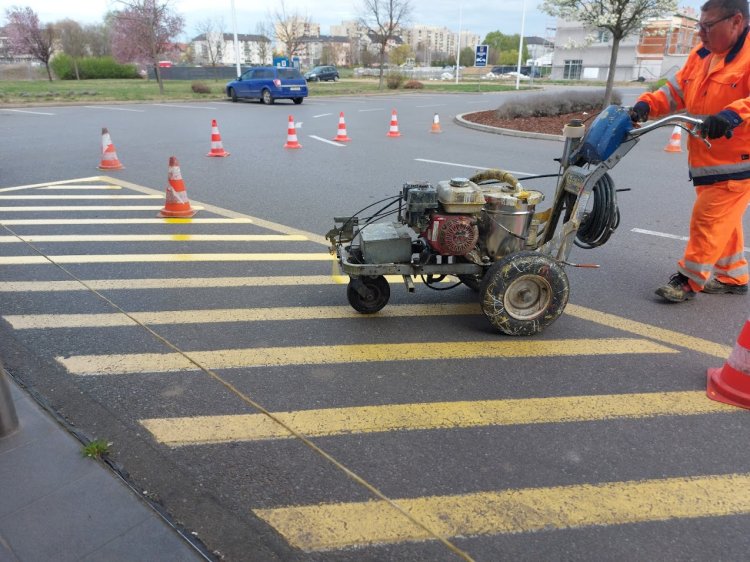 Újrafestik az útburkolati jeleket a nyíregyházi bevásárlóközpontoknál.