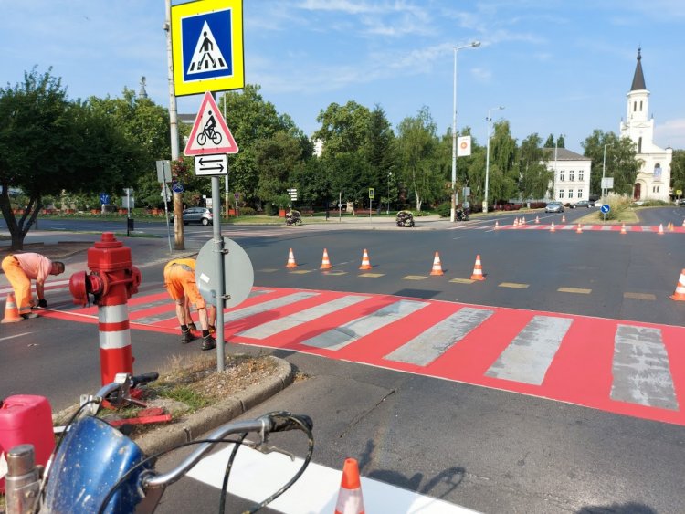 Burkolati jeleket festettek a belvárosban, a piros színű zebrákat az Országzászló téren újították fel.